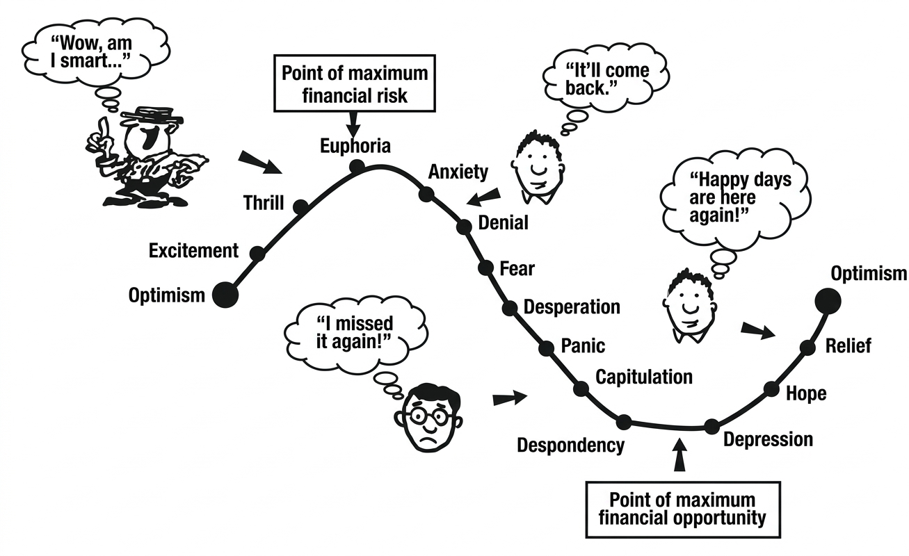 Euphoria at the Peak: Investors feel "smart" and excited at the market's high point, which is also the point of maximum financial risk.